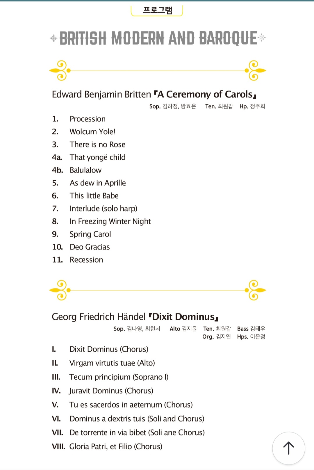 무대에 합창단 자리만 보이고, 오케스트라 자리가 안 보이기에, 어떻게 하는 거지? 하고 궁금했는데, 1부 에드워드 벤저민 브리튼의 "세레모니 오브 캐롤"은 오직 하프 하나만 반주를 합니다. 그레고리오 성가 같은 분위기입니다. 11곡 중 제7곡은 하프의 독주입니다.